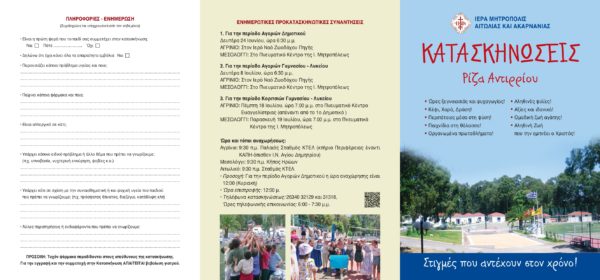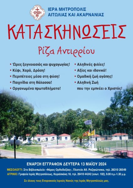 13/05/2024 13/05/2024 Από την Δευτέρα 13 Μαΐου 2024 ξεκινούν οι εγγραφές στις Κατασκηνώσεις της Ιεράς Μητροπόλεως Αιτωλίας και Ακαρνανίας. Οι εγγραφές θα πραγματοποιούνται καθημερινά: α) στο Μεσολόγγι, στο Βιβλιοπωλείο της Ιεράς Μητροπόλεως «Φάρος Ορθοδοξίας» (Πλατεία Κέννεντυ, τηλ. 26310 26549), β) στο Αγρίνιο, στα Γραφεία της Ιεράς Μητροπόλεως (Καραϊσκάκη 18, τηλ. 2641044242 (εσωτ. 102), ώρες 09:00’-13:30’) και γ)...