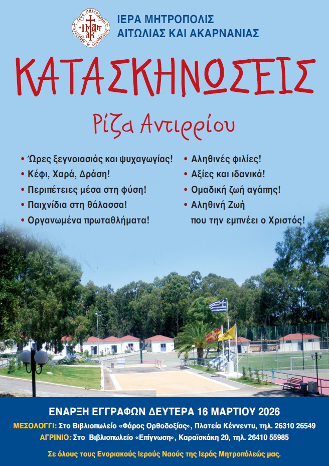 Με δέκα κατασκηνωτικές περιόδους θα λειτουργήσουν το ερχόμενο Καλοκαίρι, οι Κατασκηνώσεις της Ιεράς Μητροπόλεως Αιτωλίας και Ακαρνανίας, στις παραθαλάσσιες εγκαταστάσεις στην περιοχή της Ρίζας Αντιρρίου.
