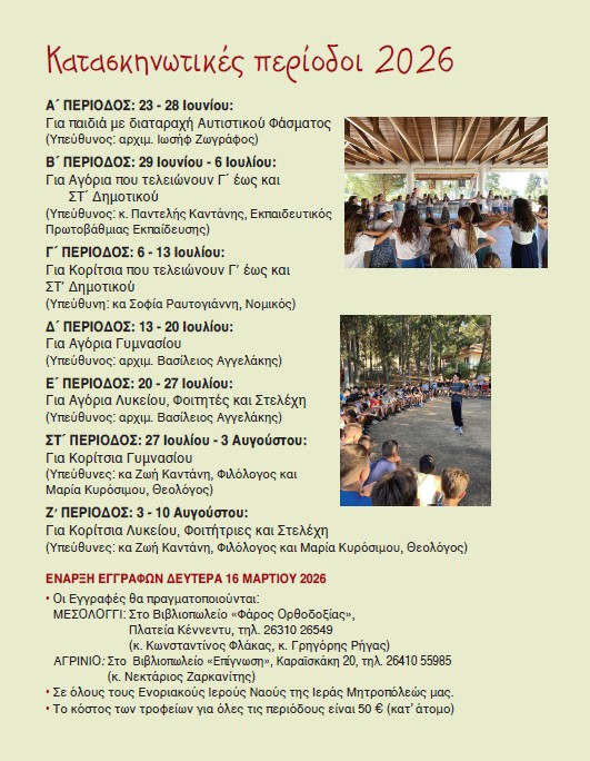 Επτά περίοδοι για αγόρια και κορίτσια Δημοτικού, Γυμνασίου, Λυκείου, Φοιτητές και Φοιτήτριες και παιδιά με διαταραχή αυτιστικού φάσματος. Οι συμμετέχοντες θα έχουν την εξαιρετική ευκαιρία να βιώσουν τη χριστιανική ζωή μέσα σε ένα περιβάλλον φυσικής ομορφιάς, χαράς, τραγουδιού, παιχνιδιού, καθαρής ψυχαγωγίας, συμπνευματισμού και ελεύθερου διαλόγου, μιας εμπειρίας που ισοδυναμεί με όλη την κατηχητική προσπάθεια του ιεραποστολικού έτους.