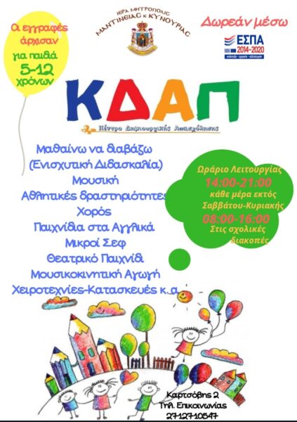 Κέντρο Δημιουργικής Απασχόλησης (ΚΔΑΠ) από την Ι.Μ. Μαντινείας και Κυνουρίας