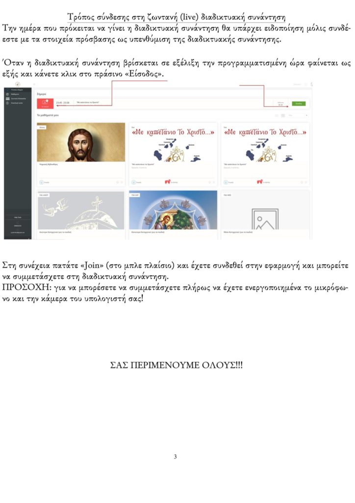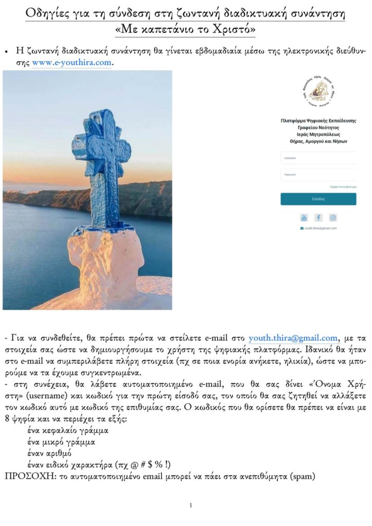 Στις φωτογραφίες μπορείτε να βρείτε οδηγίες για τον τρόπο σύνδεσης στο πρόγραμμα και την συμμετοχή όλων στις διαδικτυακές συναντήσεις του Γραφείου Νεότητος της Ιεράς Μητροπόλεως Θήρας, Αμοργού και Νήσων.