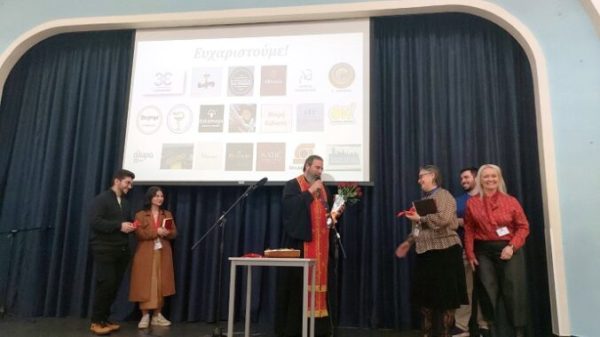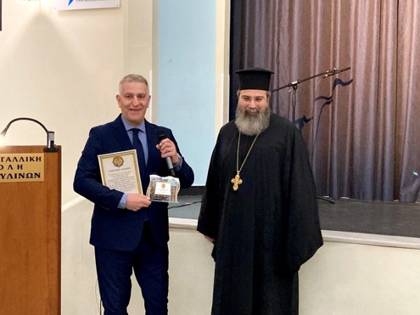 Σημαντική στιγμή της βραδιάς ήταν η βράβευση της Ελληνογαλλικής Σχολής Ουρσουλινών. Ο π. Γεώργιος τίμησε τον Γενικό Διευθυντή της Σχολής, κ. Βασίλειο Σπυρογιάννη, και την Υπεύθυνη Δημοσίων Σχέσεων, κα Λάϊνα Τζωρτζάτου, για την άψογη συνεργασία του Σχολείου με την Ενορία της Αγίας Σοφίας, την από κοινού ανάπτυξη εκπαιδευτικών προγραμμάτων και την προσφορά τους στην πνευματική καλλιέργεια των μαθητών.