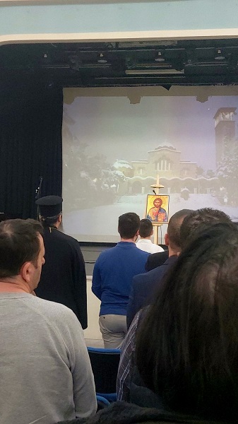 Την εκδήλωση τίμησε με την παρουσία του, ως εκπρόσωπος του Μακαριωτάτου Αρχιεπισκόπου Αθηνών και πάσης Ελλάδος κ.κ. Ιερωνύμου Β’, ο Πανοσιολογιώτατος Αρχιμανδρίτης π. Μιχαήλ Σταθάκης. Ο π. Μιχαήλ μετέφερε τις πατρικές ευχές του Μακαριωτάτου και στον εμπνευσμένο χαιρετισμό του μίλησε για την τεράστια προσφορά των Αγίων Τριών Ιεραρχών στην Παιδεία, τονίζοντας με έμφαση πως η Επιστήμη και η Πίστη δεν είναι έννοιες ασύμβατες, αλλά αντίθετα οφείλουν να συνδέονται, να συνυπάρχουν και να συνεργάζονται αρμονικά για την πρόοδο του ανθρώπου.