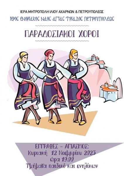 Την Κυριακή 12 Νοεμβρίου 2023 στις 19:00 ξεκινούν μαθήματα παραδοσιακών χορών στην ενορία της Αγίας Τριάδας Πετρουπόλεως.