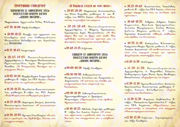 - Παρασκευή 12 Ιανουαρίου 2024 και ώρα 18.00, στο Πολιτιστικό Κέντρο του Δήμου Αιγιαλείας «Αλέκος Μέγαρης»: Έναρξη των εργασιών του Συνεδρίου από τον Σεβασμιώτατο Μητροπολίτη Καλαβρύτων και Αιγιαλείας κ. Ιερώνυμο.
