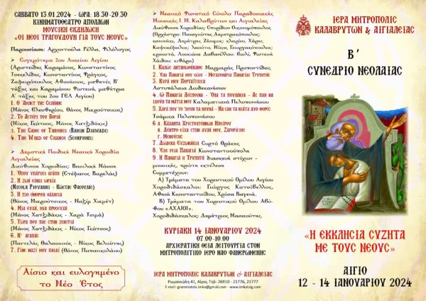 - Σάββατο 13 Ιανουαρίου και ώρα 18.30, στον Κινηματογράφο «Απόλλων» της πόλεως του Αιγίου: Μουσική εκδήλωση με τίτλο «Οι Νέοι τραγουδούν για τους Νέους», με τη συμμετοχή μουσικών νεανικών συνόλων του 2ου ΓΕΛ Αιγίου, της Δημοτικής Παιδικής Νεανικής Χορωδίας Αιγιαλείας, του Νεανικού Φωνητικού Συνόλου Παραδοσιακής Μουσικής της Ιεράς Μητροπόλεώς μας και των χορευτικών τμημάτων των Ομίλων Αιγίου και Αβύθου.