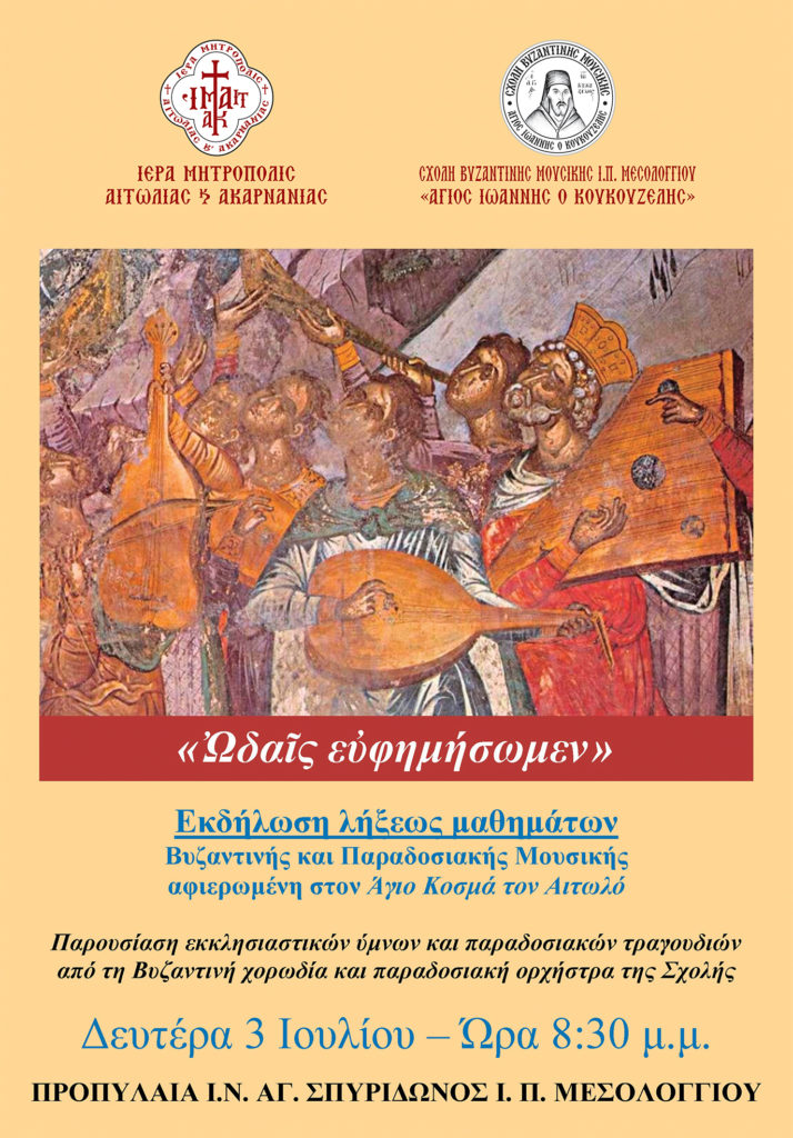 Η Σχολή Βυζαντινής Μουσικής Μεσολογγίου «Άγιος Ιωάννης ο Κουκουζέλης» της Ιεράς Μητρόπολης Αιτωλίας και Ακαρνανίας, με την ευκαιρία της λήξεως του τρέχοντος σχολικού έτους, θα πραγματοποιήσει μουσική εκδήλωση, στον προαύλιο χώρο του Ιερού Μητροπολιτικού Ναού Αγίου Σπυρίδωνος Ιεράς Πόλεως Μεσολογγίου, την Δευτέρα 3 Ιουλίου 2023 και ώρα 20:30’ μ.μ.
