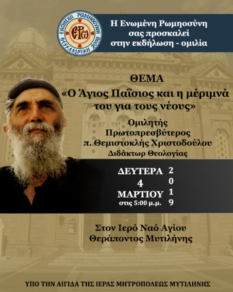 Η ΕΝΩΜΕΝΗ ΡΩΜΙΟΣΥΝΗ σας προσκαλεί στην Εκδήλωση – Ομιλία υπό το θέμα “Ο Άγιος Παΐσιος και η μέριμνα του για τους νέους” με ομιλητή τον Πρωτοπρεσβύτερο π. Θεμιστοκλή Χριστοδούλου, Διδάκτωρ Θεολογίας, η οποία θα πραγματοποιηθεί, κατά τη Δευτέρα 4 Μαρτίου 2019, στον Ιερό Ναό Αγίου Θεράποντος Μυτιλήνης. Ώρα 5.00 μ.μ.