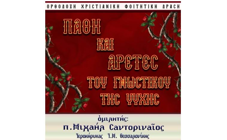 Η Χριστιανική Φοιτητική Δράση Θεσσαλονίκης διοργανώνει ομιλία, κατά την Τετάρτη 27 Μαρτίου 2019 και ώρα 8.00 μ.μ., με ομιλητή τον π. Μιχαήλ Σαντοριναίο, ιεροκήρυκα της Ι.Μ. Θεσσαλονίκης, υπό το θέμα: “ΠΑΘΗ ΚΑΙ ΑΡΕΤΕΣ ΤΟΥ ΓΝΩΣΤΙΚΟΥ ΤΗΣ ΨΥΧΗΣ”. Αίθουσα “Μέγας Βασίλειος”, Αλ. Σβώλου 42, Α’ όροφος.