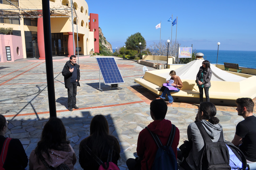 Ο επιστημονικός συνεργάτης και Υπεύθυνος του Ινστιτούτου Θεολογίας και Οικολογίας, Παραρτήματος της ΟΑΚ, Αντώνης Καλογεράκης, συζήτησε με τους μαθητές για τα θέματα των ΑΠΕ και τους έδειξε στην πράξη, τον τρόπο λειτουργίας ένα φωτοβολταϊκού πάνελ με μπαταρία, μέσω του οποίου παράγεται ηλεκτρική ενέργεια, χωρίς να εκπέμπονται τοπικά ρύποι.