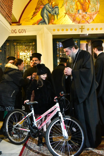 Ο Σεβασμιώυτατος Μητροπολίτης κ. Θεολόγος ευλόγησε με την πατρική του παρουσία όλους και βεβαίως ήταν εκεί και στην κλήρωση για τα παιδιά με πλούσια δώρα. Κατ’ αυτή προσεφέρθησαν πολλά βιβλία, ποδήλατα, επιτραπέζια παιχνίδια και δόθηκαν διάφορα γλυκίσματα.