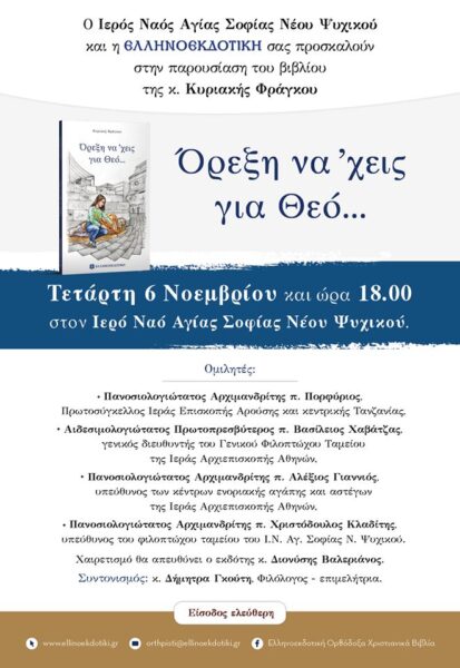 Ο Ιερός Ναός Αγίας Σοφίας Ψυχικού και η Ελληνοεκδοτική διοργανώνουν την Τετάρτη 6 Νοεμβρίου την παρουσίαση του βιβλίου της κ. Κυριακής Φράγκου με τίτλο: “Όρεξη να’ χεις για Θεό”.