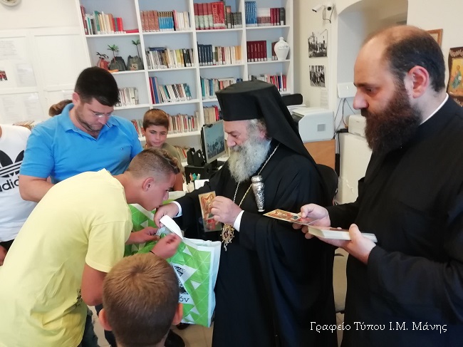 Η ενορία του Αγίου Χαραλάμπους Κότρωνα προσεκάλεσε τον Μητροπολίτη Μάνης, κ. Χρυσόστομο Γ’, κατά την Πέμπτη 5 Σεπτεμβρίου 2019, το απόγευμα, και σε συνάντηση μαθητών και μαθητριών στο Πνευματικό Κέντρο της ενορίας, ο Σεβασμιώτατος διένειμε στα παιδιά σχολικές τσάντες με γραφική ύλη ενόψει της νέας σχολικής χρονιάς, αφού προηγουμένως έδωσε τις κατάλληλες πατρικές του συμβουλές.