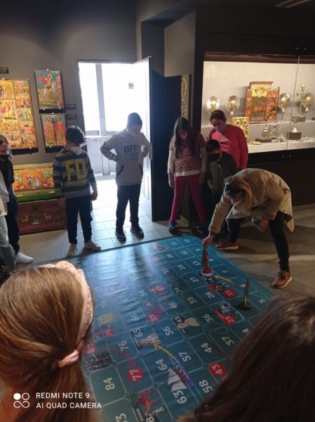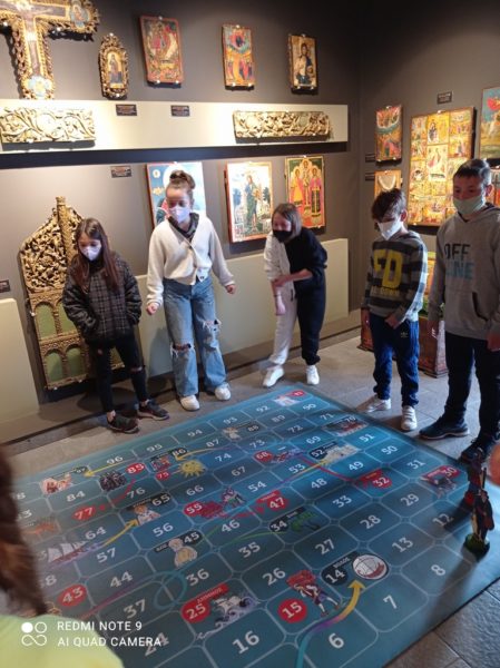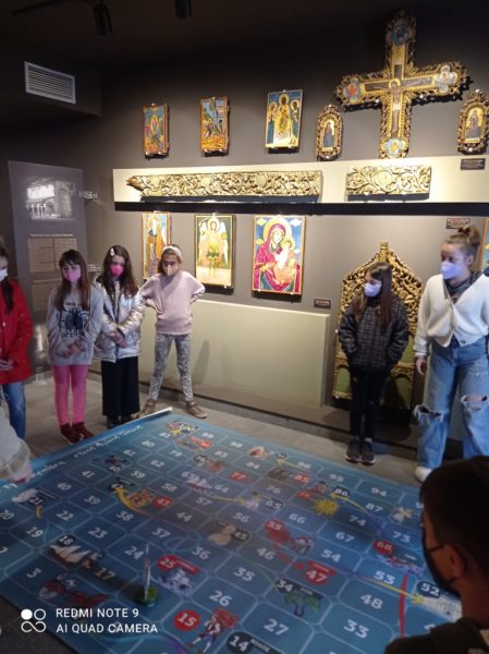 Τα παιδιά θαύμασαν τα τρία μεγάλων διαστάσεων Προσκυνητάρια των Αγίων Τόπων στη συλλογή του μουσείου και παρατήρησαν τις σκηνές που απεικονίζουν, την τοπογραφία των ιερών προσκυνημάτων που σχετίζονται με τη ζωή του Χριστού. Στο τέλος του εκπαιδευτικού προγράμματος, η ομάδα των μαθητών μέσα από ένα παιχνίδι ρόλων, μεταμορφώθηκαν σε «προσκυνητές» και με τη βοήθεια ενός επιδαπέδιου παιχνιδιού ξεκίνησαν από τη Μακρινίτσα με προορισμό τα Ιεροσόλυμα.