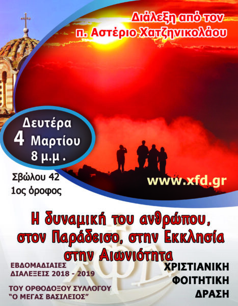 Κατά τη Δευτέρα 4 Μαρτίου 2019 και ώρα 8 μ.μ., η Χριστιανική Φοιτητική Δράση Θεσσαλονίκης διοργανώνει ομιλία υπό του π. Αστερίου Χατζηνικολάου με θέμα “Η δυναμική του ανθρώπου στον Παράδεισο, στην Εκκλησία, στην Αιωνιότητα”, επί της οδού Σβώλου 42, 1ος όροφος.
