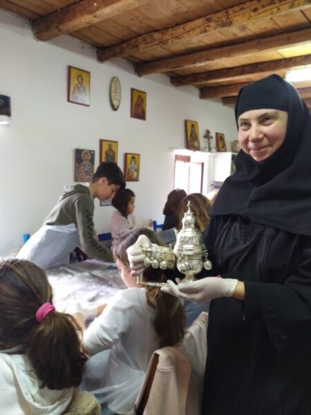 Η μοναχή τους εξήγησε τα σχετικά με τη διαδικασία κατασκευής του θυμιάματος και τους παρουσίασε μικρού μήκους βίντεο, που είχαν δημιουργήσει ειδικά για τα παιδιά της Σικίνου οι Μοναχές από την Ιερά Μονή Προφήτου Ηλία Παρνασσίδος, στο οποίο αναλυτικά παρουσιαζόταν ο τρόπος κατασκευής θυμιάματος, με προσοχή και προσευχή.