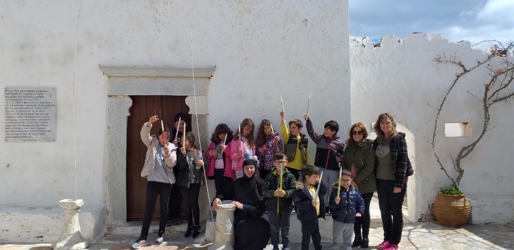 Οι μαθητριες και οι μαθητές του Σχολείου της Σικίνου, με τις Εκπαιδευτικούς τους, επεσκέφθησαν την Ιερά Μονή Χρυσοπηγής, η υπεύθυνη της οποίας, Μοναχή Δωροθέα, καθοδήγησε τα παιδιά πώς το καθένα να φιλοτεχνήσει τη δική του Πασχαλίνή λαμπάδα, τους εξήγησε γιατί δεν πρέπει να στολίζεται με άλλα παιχνίδια, τους ομίλησε για το συμβολισμό του κεριού στην Ορθόδοξη Εκκλησία, τα δίδαξε να ψάλλουν το “Κύριε ελέησον”, έμαθε τις Εκπαιδευτικούς πώς να κατασκευάζουν χυλοπίττες και ευχήθηκε σε όλους για το Άγιο Πάσχα. Πριν αναχωρήσουν από τη Μονή, οι μαθητές επεσκέφθησαν τον χώρο, πλησίον της Μονής, στον οποίο εκτρέφονται διάφορα ζώα.