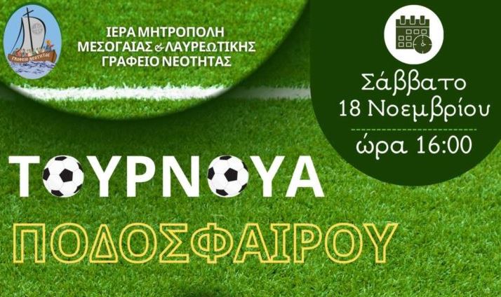 Το Γραφείο Νεότητας διοργανώνει το Β΄ Τουρνουά Ποδοσφαίρου της Μητρόπολης Μεσογαίας και Λαυρεωτικής, το οποίο θα πραγματοποιηθεί, το Σάββατο 18 Νοεμβρίου 2023, 4-7 μ.μ. στα γήπεδα ποδοσφαίρου της Ακαδημίας Fair play στην Παλλήνη, μεταξύ των αγοριών Γυμνασίου και Λυκείου των Κατηχητικών της Μητρόπολης.