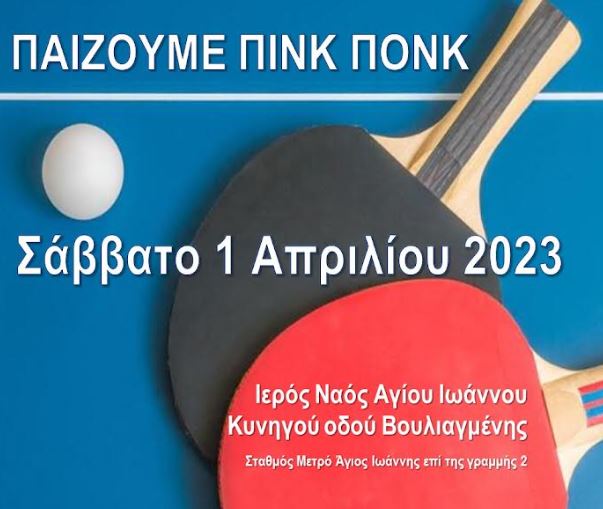 Το Ίδρυμα Νεότητας και Οικογένειας της Ιεράς Αρχιεπισκοπής Αθηνών διοργανώνει Τουρνουά Πινγκ Πονγκ για παιδιά Δημοτικού, Γυμνασίου και Λυκείου το Σάββατο 1ηΑπριλίου 2023 ώρα 11:00 π.μ. στο Πνευματικό Κέντρο του Ιερού Ναού Αγίου Ιωάννου Κυνηγού οδού Βουλιαγμένης (Λ. Βουλιαγμένης 126). Σταθμός Μετρό Άγιος Ιωάννης επί της γραμμής 2.