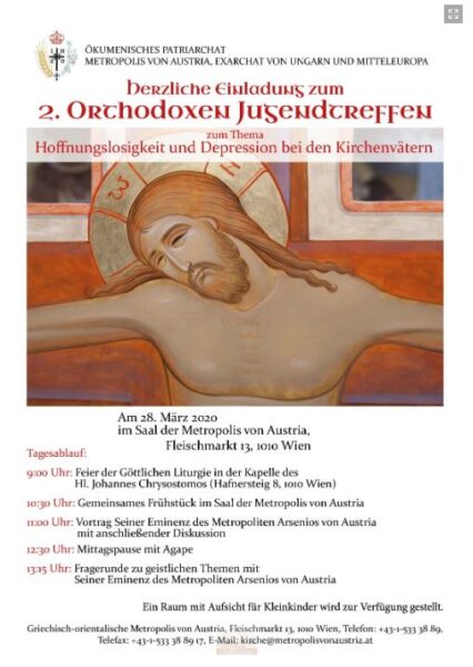 Η Β΄Συνάντηση Νεολαίας της Ι. Μητροπόλεως Αυστρίας θα πραγματοποιηθεί στις 28 Μαρτίου, το Σάββατο της Δ΄ Εβδομάδος των Νηστειών. Θέμα της συναντήσεως είναι «Απελπισία και κατάθλιψη κατά τους Πατέρες της Εκκλησίας».
