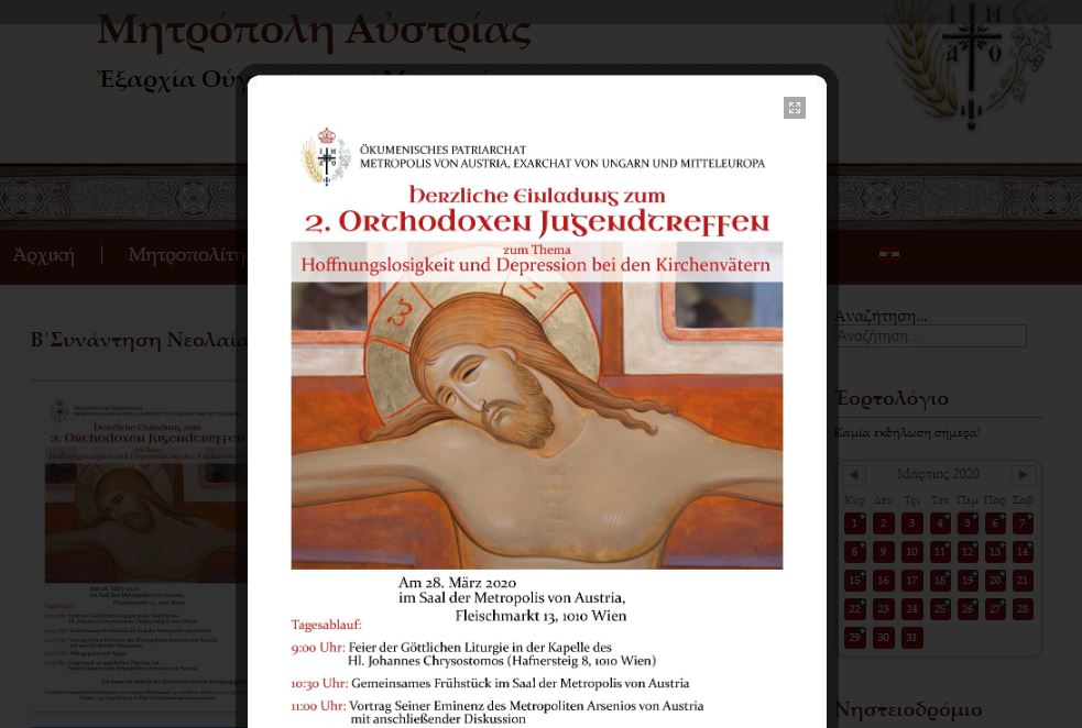 Η Β΄Συνάντηση Νεολαίας της Ι. Μητροπόλεως Αυστρίας θα πραγματοποιηθεί στις 28 Μαρτίου, το Σάββατο της Δ΄ Εβδομάδος των Νηστειών. Θέμα της συναντήσεως είναι «Απελπισία και κατάθλιψη κατά τους Πατέρες της Εκκλησίας».