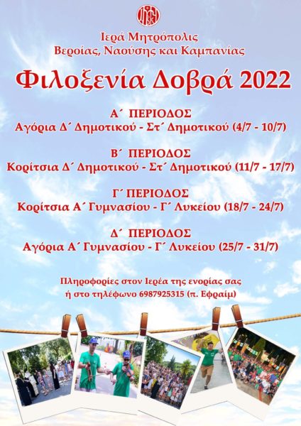 Για ακόμη μία χρονιά η Ιερά Μητρόπολις Βεροίας, Ναούσης και Καμπανίας θα πραγματοποιήσει εντελώς δωρεάν κατά τον μήνα Ιούλιο το πρόγραμμα «Φιλοξενία Δοβρά» για παιδιά και νέους, οι οποίοι συμμετείχαν στις κατηχητικές συνάξεις των ενοριών της Μητροπόλεως.