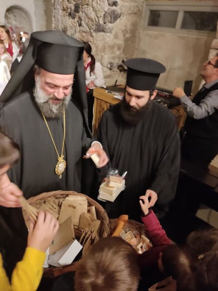 Μετά το πέρας της εκδήλωσης ο Σεβασμιώτατος διένειμε δώρα σε όλα τα παιδιά. Στον αύλειο χώρο είχε συγκροτηθεί χριστουγεννιάτικο bazaar με χριστουγεννιάτικα είδη, κατασκευές και γλυκά, τα έσοδα του οποίου θα διατεθούν προς ενίσχυση του Πτωχοκομείου Θήρας.