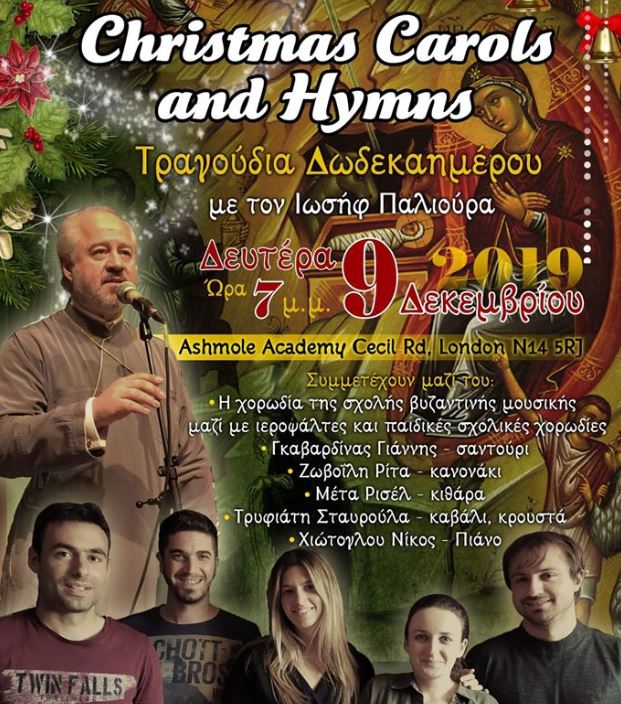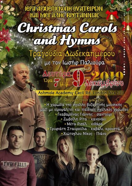 ΙΕΡΑ ΑΡΧΙΕΠΙΣΚΟΠΗ ΘΥΑΤΕΙΡΩΝ ΚΑΙ ΜΕΓΑΛΗΣ ΒΡΕΤΑΝΝΙΑΣ – Christmas Carols and Hymns, Τραγούδια Δωδεκαημέρου με τον π. Ιωσήφ Παλιούρα, κατά τη Δευτέρα 9 Δεκεμβρίου 2019 και ώρα 7.00 μ.μ. στην Ashmole Academy Cecil Rd. London N14 5RJ.