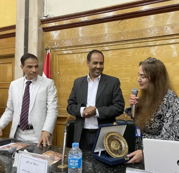 Μετά το τέλος των προσφωνήσεων ο Κοσμήτορας της Φιλοσοφικής Σχολής του Πανεπιστημίου Καΐρου απένειμε επίσημο αναμνηστικό του Πανεπιστημίου στην επικεφαλής των φιλοξενουμένων κ. Τζίνα Καλογήρου, η οποία ευχαρίστησε ιδιαιτέρως για τη συνεργασία.