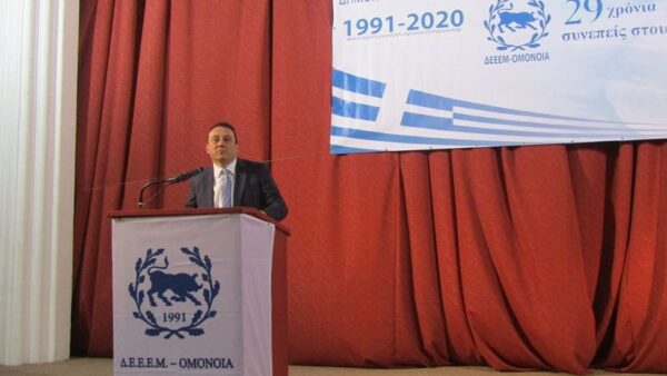 Την κεντρική Ομιλία της Εκδήλωσης είχε ο Πρόεδρος της ΔΕΕΕΜ ΟΜΟΝΟΙΑ κ. Βασίλης Κάγιος αναφερόμενος ειδικά στο γεγονός ότι η Οργάνωση αντέχει, 29 χρόνια μετά την ίδρυση της, μένει πιστή στους πολιτικούς της στόχους και στο πρόγραμμα, συνεχίζει να αποτελεί βασικό μοχλό για τους αγώνες της ΕΕΜ σε ένα ασταθές πολιτικό τοπίο και ειδικά στην αντιμετώπιση πολιτικών των Τιράνων που πολλές φορές στόχο έχουν την εκδίωξη των ελλήνων απ’ τη γενέθλια γης τους.