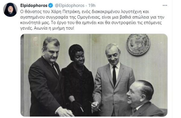 “Ο θάνατος του Χάρη Πετράκη, ενός διακεκριμένου λογοτέχνη και αγαπημένου συγγραφέα της Ομογένειας, είναι μια βαθιά απώλεια για την κοινότητά μας” αναφέρει ο Σεβασμιώτατος Αρχιεπίσκοπος Αμερικής κ. Ελπιδοφόρος σε επίκαιρη ανάρτησή του. “Το έργο του θα εμπνέει και θα συντροφεύει τις επόμενες γενιές. Αιωνία η μνήμη του!”.
