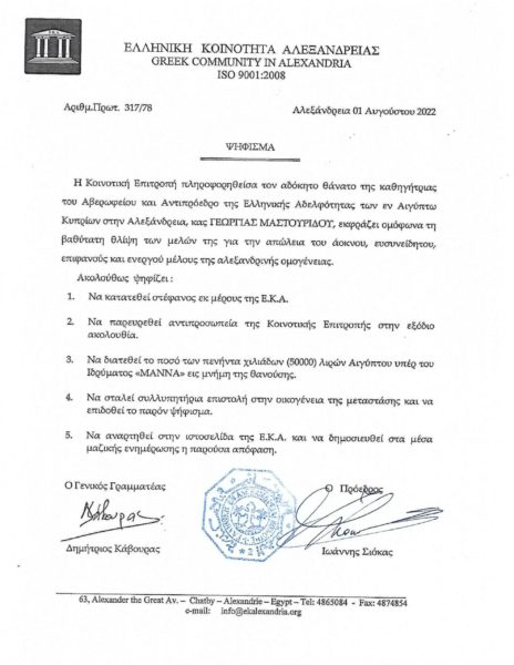 Τη θλίψη της για τον «αδόκητο θάνατο της καθηγήτριας του Αβερωφείου και Αντιπροέδρου της Ελληνικής Αδελφότητας των εν Αιγύπτω Κυπρίων στην Αλεξάνδρεια, Γεωργίας Μαστουρίδου», εξέφρασε η Κοινοτική Επιτροπή των Ελλήνων της Αλεξάνδρειας, με το εξής ψήφισμα: