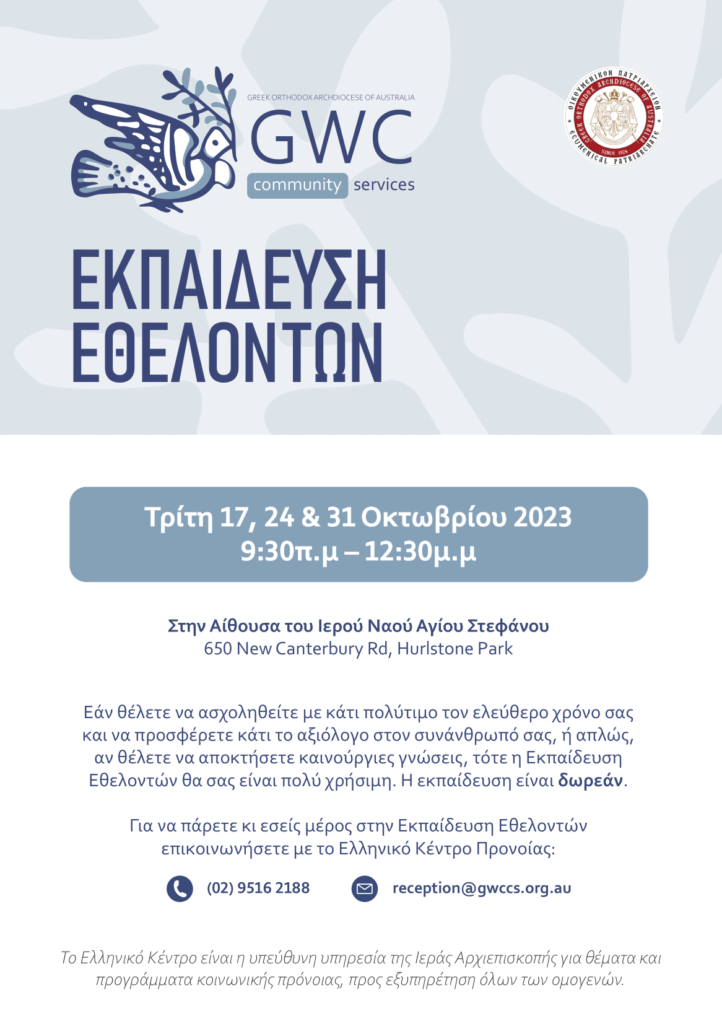 Το Ελληνικό Κέντρο Προνοίας της Ιεράς Αρχιεπισκοπής Αυστραλίας διοργανώνει εκπαίδευση εθελοντών για όσους επιθυμούν να προσφέρουν στους συνανθρώπους τους ή απλώς να εξελίξουν τις γνώσεις τους.