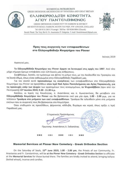 Η Ελληνορθόδοξη Κοινότητα Αγίου Παντελεήμονος της Ιεράς Αρχιεπισκοπής Θυατείρων και Μεγάλης Βρετανίας προσκαλεί τις οικογένειες των ενταφιασθέντων στο Ελληνορθόδοξο Κοιμητήριο του Pinner να προσέλθουν στον Ιερό Ναό Αγίου Παντελεήμονος και Αγίας Παρασκευής για την τέλεση του καθιερωμένων Τρισαγίων, το Ψυχοσάββατο, το πρωί, πριν την Πεντηκοστή, στις 15 Ιουνίου 2019.