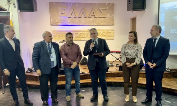 Στην Ελληνική Κοινότητα Μοντεβιδέο απευθυνόμενος στα μέλη της μετέφερε τον χαιρετισμό του Προέδρου της Βουλής κ. Κώστα Τασούλα. Εξέφρασε τη χαρά του γιατί η Ελληνική Κοινότητα, η οποία χτίστηκε σε οικόπεδο που δώρισε ο Μικρασιάτης Αριστοτέλης Ωνάσης, και οικοδομήθηκε με δωρεά ενός άλλου Μικρασιάτη, του Κωνσταντίνου Κονιαλίδη -αμφότεροι δραστηριοποιήθηκαν επιχειρηματικά στην Ουρουγουάη-, είναι μια κυψέλη για τον ελληνισμό, για τη διδασκαλία της ελληνικής γλώσσας και των χορών μας. Στην Ουρουγουάη, από τους πρώτους Έλληνες που εγκαταστάθηκαν ήταν πρόσφυγες από τη Μικρά Ασία που πρόκοψαν. Φέτος, που τιμούμε τη μνήμη της τραγικής επετείου των 100 χρόνων της Μικρασιατικής Καταστροφής είναι χρέος μας να μην λησμονήσουμε τις ρίζες μας και να διατρανώσουμε την αποφασιστικότητά μας να προασπίσουμε τα εθνικά μας δίκαια έναντι κάθε επιβουλής». Σε ένδειξη ευγνωμοσύνης προς την ηγεσία της Ελληνικής Κοινότητας Μοντεβιδέο, τον πρόεδρο κ. Παναγιώτη Χατζηράλλη και τον αντιπρόεδρο κ. Παύλο Αυγουστή ο Έλληνας Βουλευτής προσέφερε εκ μέρους της Βουλής των Ελλήνων αντίγραφα έργων του κοινοβουλίου με θέμα τοπία της αρχαίας Ελλάδας.