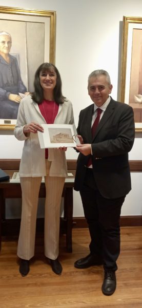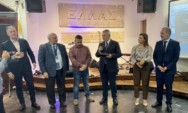 Ο Μάξιμος Χαρακόπουλος προσφέρει αναμνηστικά στο προεδρείο της Ελληνικής Κοινότητας Μοντεβιδέο.