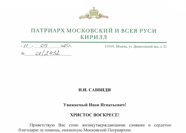 Το Φιλανθρωπικό Ίδρυμα Ιβάν Σαββίδη έλαβε ευχαριστήριες επιστολές από τους επικεφαλής των Ορθοδόξων Εκκλησιών της Ελλάδας και της Ρωσίας, τον Πατριάρχη Μόσχας και πασών των Ρωσιών κ.κ. Κύριλλο και τον Αρχιεπίσκοπο Αθηνών και πάσης Ελλάδος κ.κ. Ιερώνυμο, σχετικά με τη βοήθεια που δόθηκε κατά τη διάρκεια της πανδημίας.