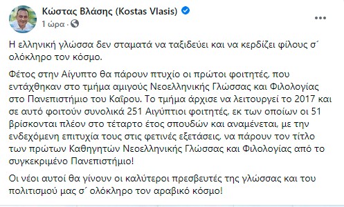 Σε ανάρτησή του στα Μέσα Κοινωνικής Δικτύωσης ο Υφυπουργός σημείωσε: “Φέτος στην Αίγυπτο θα πάρουν πτυχίο οι πρώτοι φοιτητές, που εντάχθηκαν στο τμήμα αμιγούς Νεοελληνικής Γλώσσας και Φιλολογίας στο Πανεπιστήμιο του Καΐρου. Το τμήμα άρχισε να λειτουργεί το 2017 και σε αυτό φοιτούν συνολικά 251 Αιγύπτιοι φοιτητές, εκ των οποίων οι 51 βρίσκονται πλέον στο τέταρτο έτος σπουδών και αναμένεται, με την ενδεχόμενη επιτυχία τους στις φετινές εξετάσεις, να πάρουν τον τίτλο των πρώτων Καθηγητών Νεοελληνικής Γλώσσας και Φιλολογίας από το συγκεκριμένο Πανεπιστήμιο!”