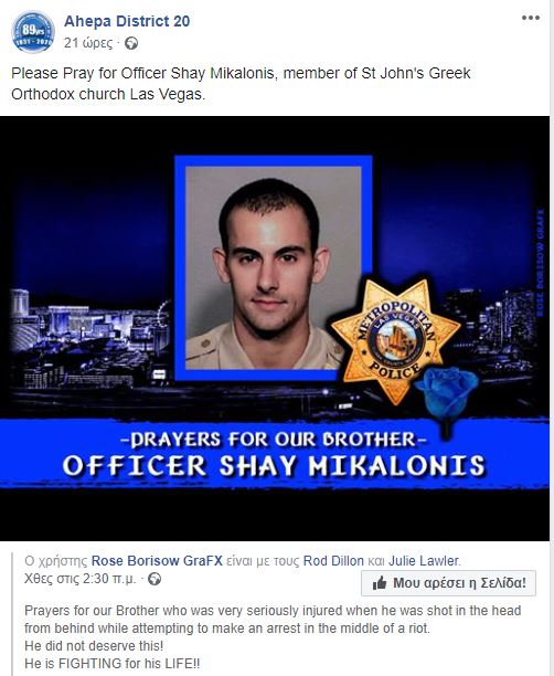 «Παρακαλούμε προσευχηθείτε για τον Αστυνομικό Shay Mikalonis, μέλος της Ελληνορθόδοξης Κοινότητας του Αγίου Ιωάννη στο Λας Βέγκας», αναφέρει η ανάρτηση.