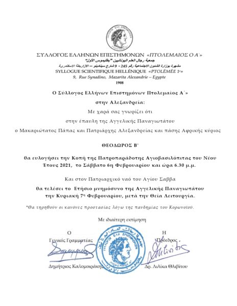 Την Βασιλόπιτα για το 2021 κόβει ο Σύλλογος Ελλήνων Επιστημόνων «Πτολεμαίος Α» το προσεχές Σάββατο 6 Φεβρουαρίου, στις 6.30 το απόγευμα, στην έδρα του, την έπαυλη που άφησε με διαθήκη η αείμνηστη Αγγελική Παναγιωτάτου στην Αλεξάνδρεια της Αιγύπτου. Την κοπή της βασιλόπιτας θα ευλογήσει ο Πάπας και Πατριάρχης Αλεξανδρείας και Πάσης Αφρικής Θεόδωρος Β΄. Tην επομένη, ο Προκαθήμενος του Δευτερόθρονου Πατριαρχείου θα τελέσει στον Πατριαρχικό ναό του Αγίου Σάββα το ετήσιο μνημόσυνο της Αγγελικής Παναγιωτάτου.