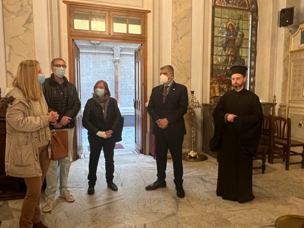 Ο Γ. Πατούλης επισκέφθηκε τον Ελληνορθόδοξο Ιερό Ναό της Κοιμήσεως της Θεοτόκου στον οποίο και βαπτίστηκε ο Παύλος Μελλάς. Εκεί ξεναγήθηκε από τον Ιερατικό Προϊστάμενο του ναού π. Εφραίμ. Ο κ. Πατούλης ενημερώθηκε για την ιστορία ενός από τους πλέον εμβληματικούς ναούς της Ελληνικής Διασποράς στην Ευρώπη, που λειτουργεί ανελλιπώς από το 1820 και στον οποίο υπηρετούσε μέχρι πρότινος ο νυν Μητροπολίτης Γαλλίας κ. Δημήτριος.