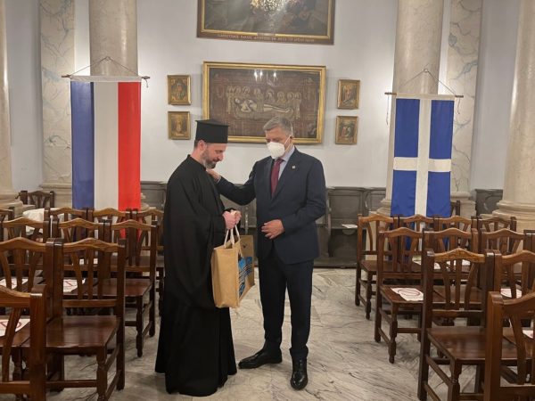 Ο Γ. Πατούλης επισκέφθηκε τον Ελληνορθόδοξο Ιερό Ναό της Κοιμήσεως της Θεοτόκου στον οποίο και βαπτίστηκε ο Παύλος Μελλάς. Εκεί ξεναγήθηκε από τον Ιερατικό Προϊστάμενο του ναού π. Εφραίμ. Ο κ. Πατούλης ενημερώθηκε για την ιστορία ενός από τους πλέον εμβληματικούς ναούς της Ελληνικής Διασποράς στην Ευρώπη, που λειτουργεί ανελλιπώς από το 1820 και στον οποίο υπηρετούσε μέχρι πρότινος ο νυν Μητροπολίτης Γαλλίας κ. Δημήτριος.
