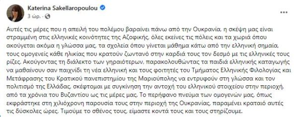 Όπως αναφέρει: «Αυτές τις μέρες που η απειλή του πολέμου βαραίνει πάνω από την Ουκρανία, η σκέψη μας είναι στραμμένη στις ελληνικές κοινότητες της Αζοφικής, όλες εκείνες τις πόλεις και τα χωριά όπου ακούγεται ακόμα η γλώσσα μας, τα σχολεία όπου γίνεται μάθημα κάτω από την ελληνική σημαία, τους ομογενείς κάθε ηλικίας που κρατούν ζωντανό στην καρδιά τους τον δεσμό με τις ελληνικές τους ρίζες».