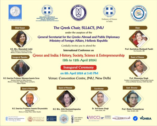 Υπό την αιγίδα της Γενικής Γραμματείας Απόδημου Ελληνισμού και Δημόσιας Διπλωματίας του Υπουργείου Εξωτερικών διοργανώθηκε στο Νέο Δελχί, στο Συνεδριακό Κέντρο του Πανεπιστημίου Τζαβαχαρλάλ Νεχρού, Συνέδριο με θέμα «Greece and India: History, Society, Science and Entrepreneurship» με θέμα την προαγωγή του ακαδημαϊκού διαλόγου μεταξύ κορυφαίων ΑΕΙ και ακαδημαϊκών από την Ινδία και την Ελλάδα.