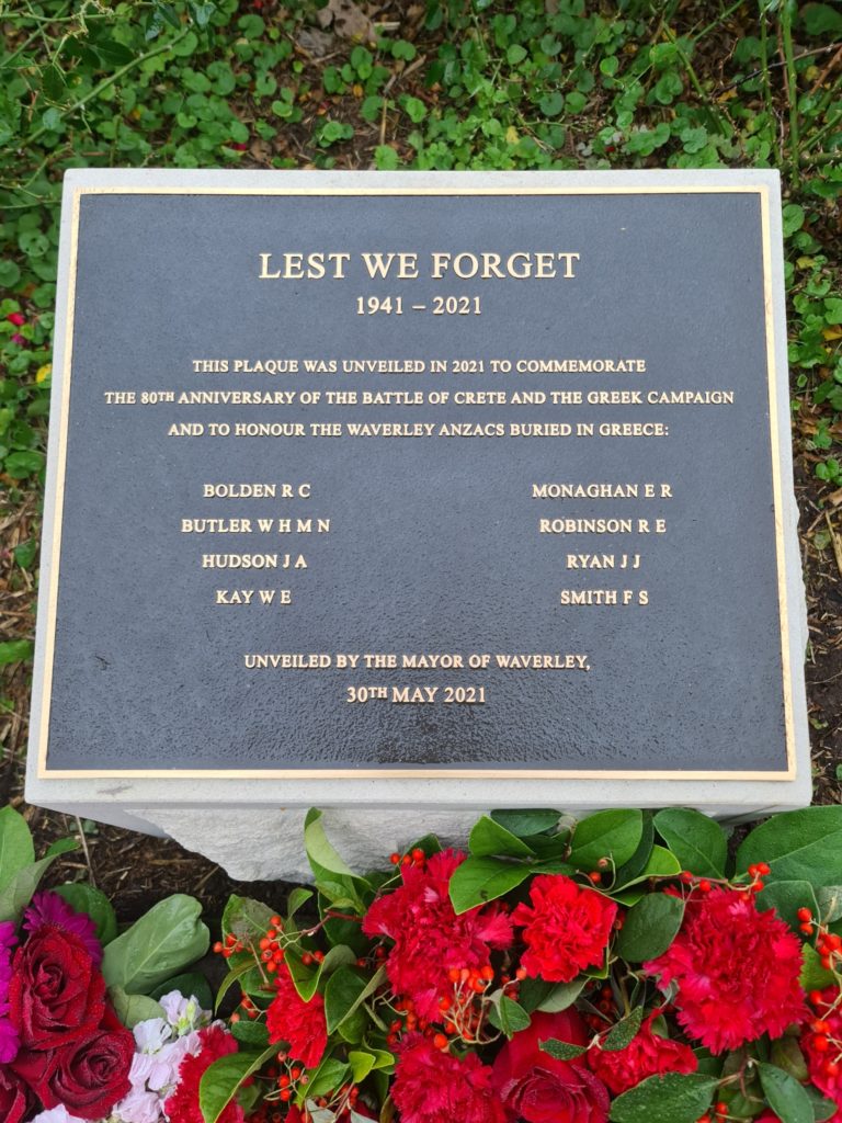 Πρόκειται για μία τιμητική πλάκα, που τοποθετήθηκε με πρωτοβουλία της ελληνικής καταγωγής δημάρχου του Waverley, κ. Paula Masselos, στην οποία αναγράφονται τα ονόματα οχτώ Αυστραλών στρατιωτών από το Waverley, ο οποίοι την Άνοιξη του 1941 πολέμησαν και έδωσαν τη ζωή τους για την υπεράσπιση της Κρήτης, ενώ αναπαύονται στα ιερά χώματα της Μεγαλονήσου.