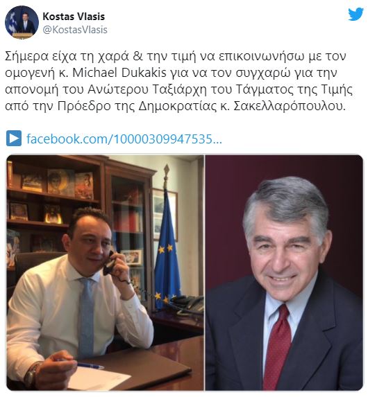 Ο υφυπουργός Εξωτερικών, Κωνσταντίνος Βλάσης, πραγματοποίησε σήμερα τηλεφωνική επικοινωνία με τον ομογενή, Μάικλ Δουκάκη (Michael Dukakis), προκειμένου να τον συγχαρεί για την απονομή του Ανώτερου Ταξιάρχη του Τάγματος της Τιμής από την Πρόεδρο της Δημοκρατίας, Κατερίνα Σακελλαροπούλου.