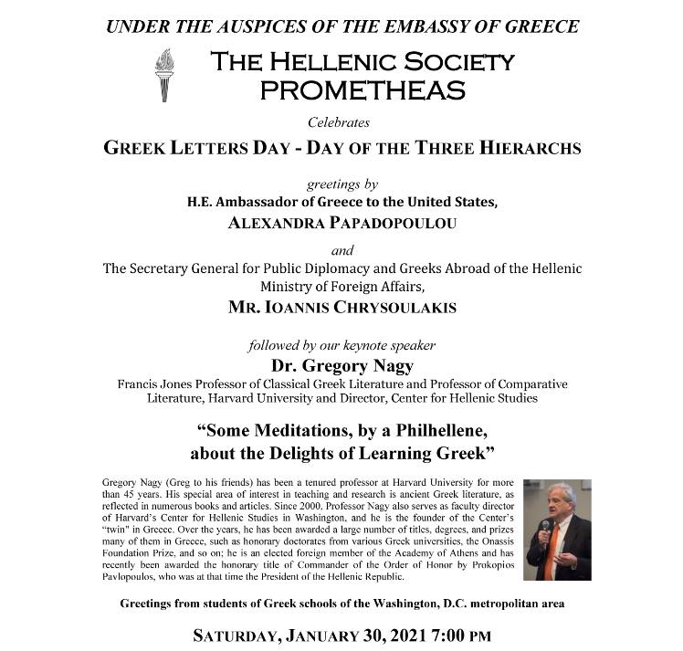 Στην εκδήλωση η οποία πραγματοποιήθηκε με αφορμή τον εορτασμό των Τριών Ιεραρχών και της Ημέρας των Ελληνικών Γραμμάτων συμμετείχε η Πρέσβης της Ελλάδας στις ΗΠΑ, κα Αλεξάνδρα Παπαδοπούλου, ενώ κεντρικός ομιλητής ήταν ο Καθηγητής και Διευθυντής του Κέντρου Ελληνικών Σπουδών του Παν/μίου Χάρβαρντ, Δρ. Gregory Nagy / Gregory Nagy , με θέμα “Some Meditations, by a Philhellene, about the Delights of Learning Greek”.