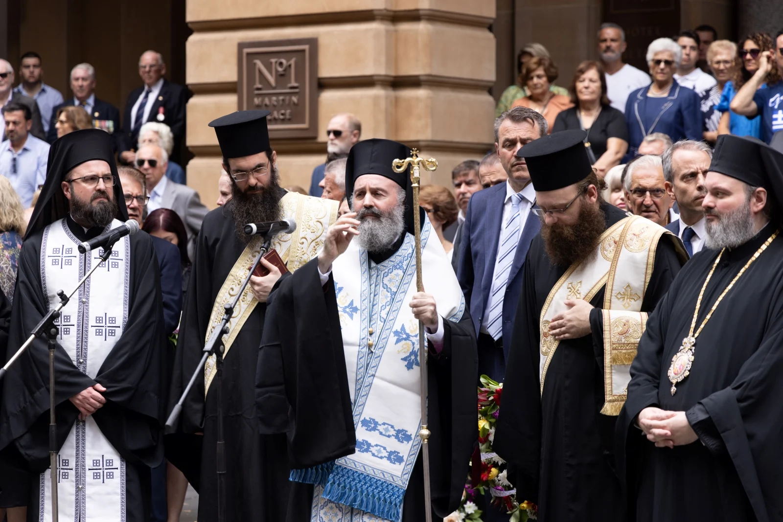 Ο Σεβασμιώτατος Αρχιεπίσκοπος Αυστραλίας κ. Μακάριος, πλαισιούμενος από τους Θεοφιλεστάτους Επισκόπους Μιλητουπόλεως κ. Ιάκωβο και Μαγνησίας κ. Χριστόδουλο, τέλεσε επιμνημόσυνη δέηση υπέρ αναπαύσεως των Ηρώων της Ελληνικής Επαναστάσεως του 1821, ενώ ακολούθησε κατάθεση στεφάνων στο Κενοτάφιο.