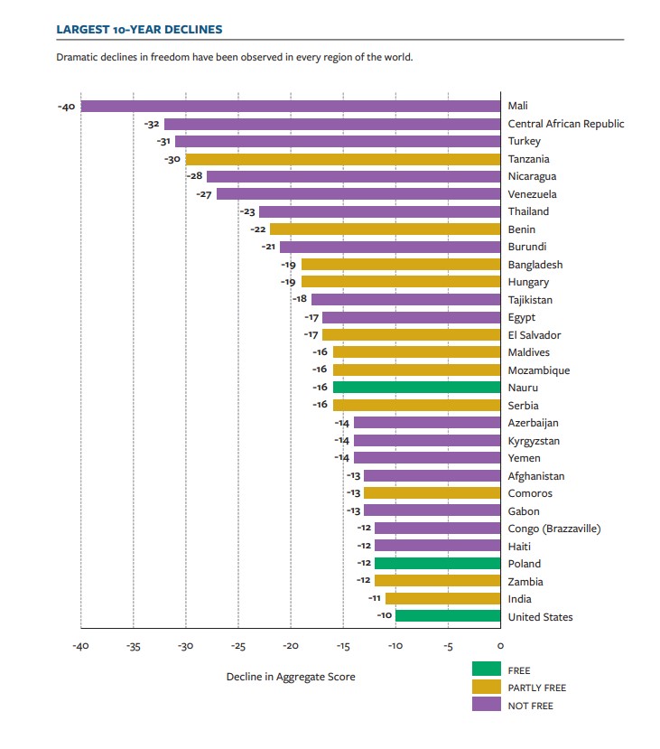 Σύμφωνα με την έκθεση του “Freedom House του 2022″, «Οι αντιδημοκρατικές δυνάμεις έχουν το πάνω χέρι στην Τουρκία, η οποία για άλλη μια φορά κατατάχθηκε ως η λιγότερο ελεύθερη χώρα στην περιοχή». Όπως δείχνει ο παρακάτω πίνακας, την τελευταία δεκαετία, η Τουρκία έχει πέσει κατά 31 μονάδες ως προς τις δημοκρατικές ελευθερίες στην χώρα.