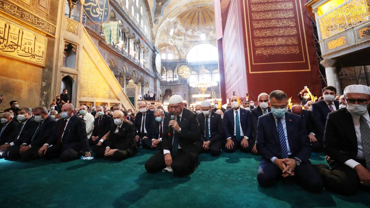 Μπροστάρης στα όσα είχαν διαδραματιστεί στην Αγία Σοφία ήταν ο διαρκώς προκλητικός Πρόεδρος Ερντογάν, ο οποίος είχε συμμετάσχει στην πρώτη μουσουλμανική προσευχή, ενώ διάβασε το ισλαμικό κάλεσμα, το Αδδάν μέσα στην Αγία Σοφία.